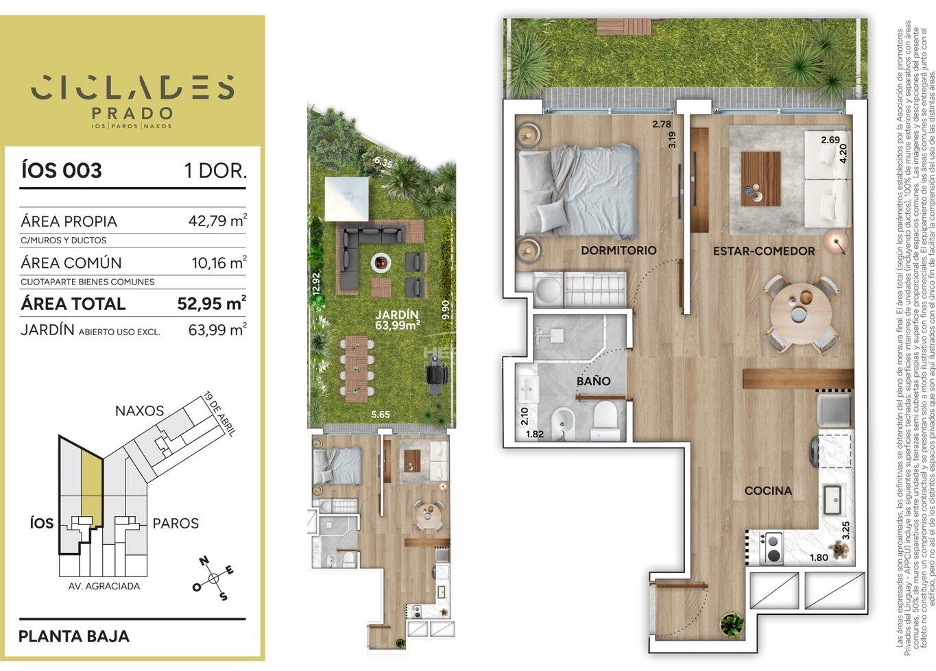 Cíclades Prado es un condominio de 3 edificios que, distribuye apartamentos en Planta baja y tres niveles de altura, IOS, PAROS Y NAXOS. Implantados en un predio que atraviesa la manzana y otorga dos frentes, sobre Avda. Agraciada y Avda. 19 de Abril.