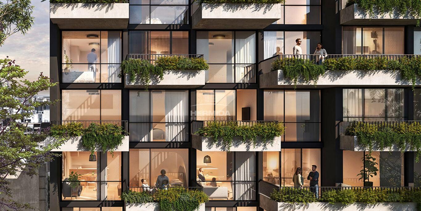 Fachada contemporánea de particular diseño, integrando el verde en sus terrazas. Calidad en terminaciones y espacios interiores de gran funcionalidad.